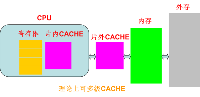 在计算机系统中存储层次可分为高速缓冲存储器(cache)、主存储器(内存)、辅助存储器(外存)三级。