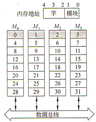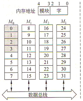 【例】设存储器容量为32字,字长64位,模块数m=4,分别用顺序方式和交