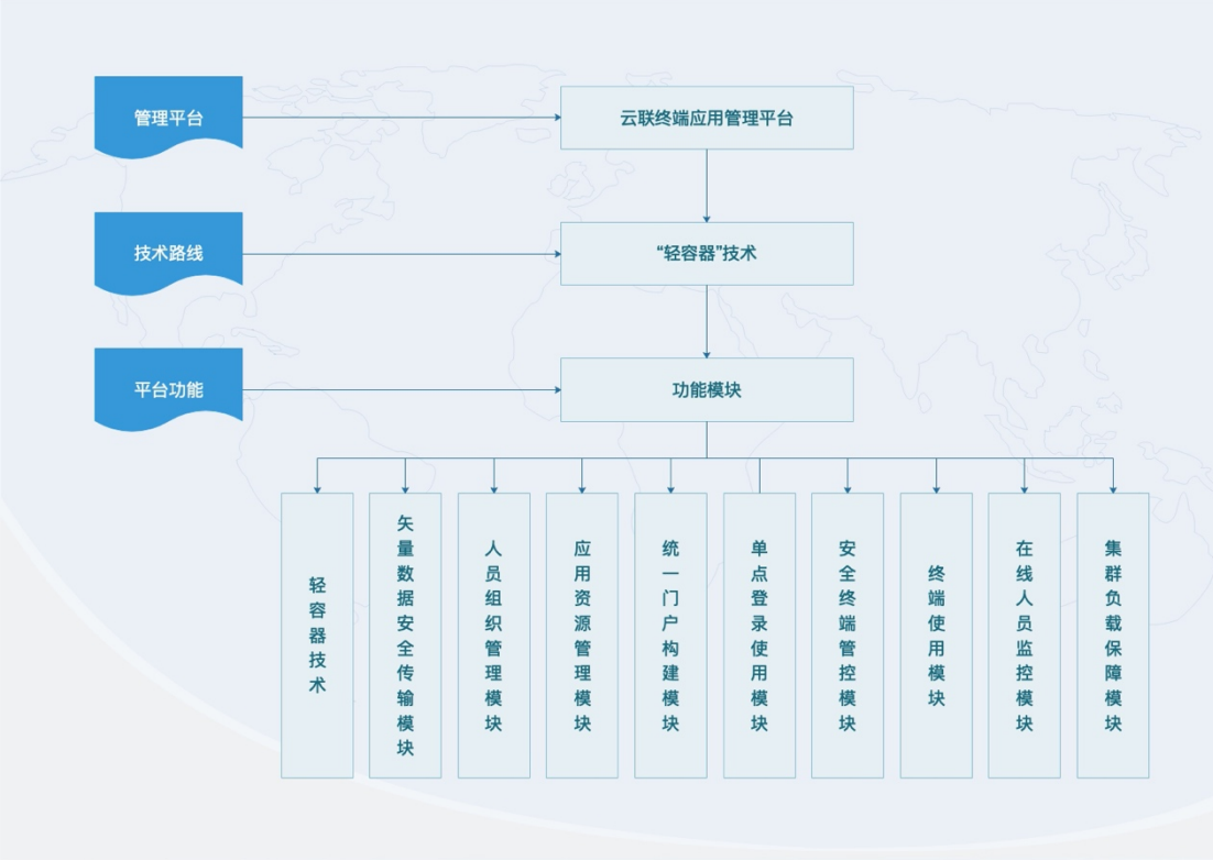 平台概述 云联终端应用管理平台是采用轻容器技术,构建使用人员操作应用系统的安全空间;此平台 能够在国产操作系统服务器与 wintel 存量服务器的共存部署,对国产桌面操作系统与 wintel 桌 面操作系统兼容使用;云联终端应用管理平台通过轻容器技术、矢量数据安全传输模块、人员组 织管理模块、应用资源管理模块、统一门户构建模块、单点登录使用模块、终端安全管控模块、 在线人员监控模块、集群负载保障模块等共同组成,最终短时间快速实现存量应用和已替换应用 能够同时在国产桌面操作系统中的无缝使用。 平台功能 云联终端应用管理平台由十大功能组成:轻容器技术、矢量数据安全传输模块、人员组织管 理模块、应用资源管理模块、统一门户构建模块、单点登录使用模块、终端安全管控模块、终端 使用模块、在线人员监控模块、集群负载保障模块组成。