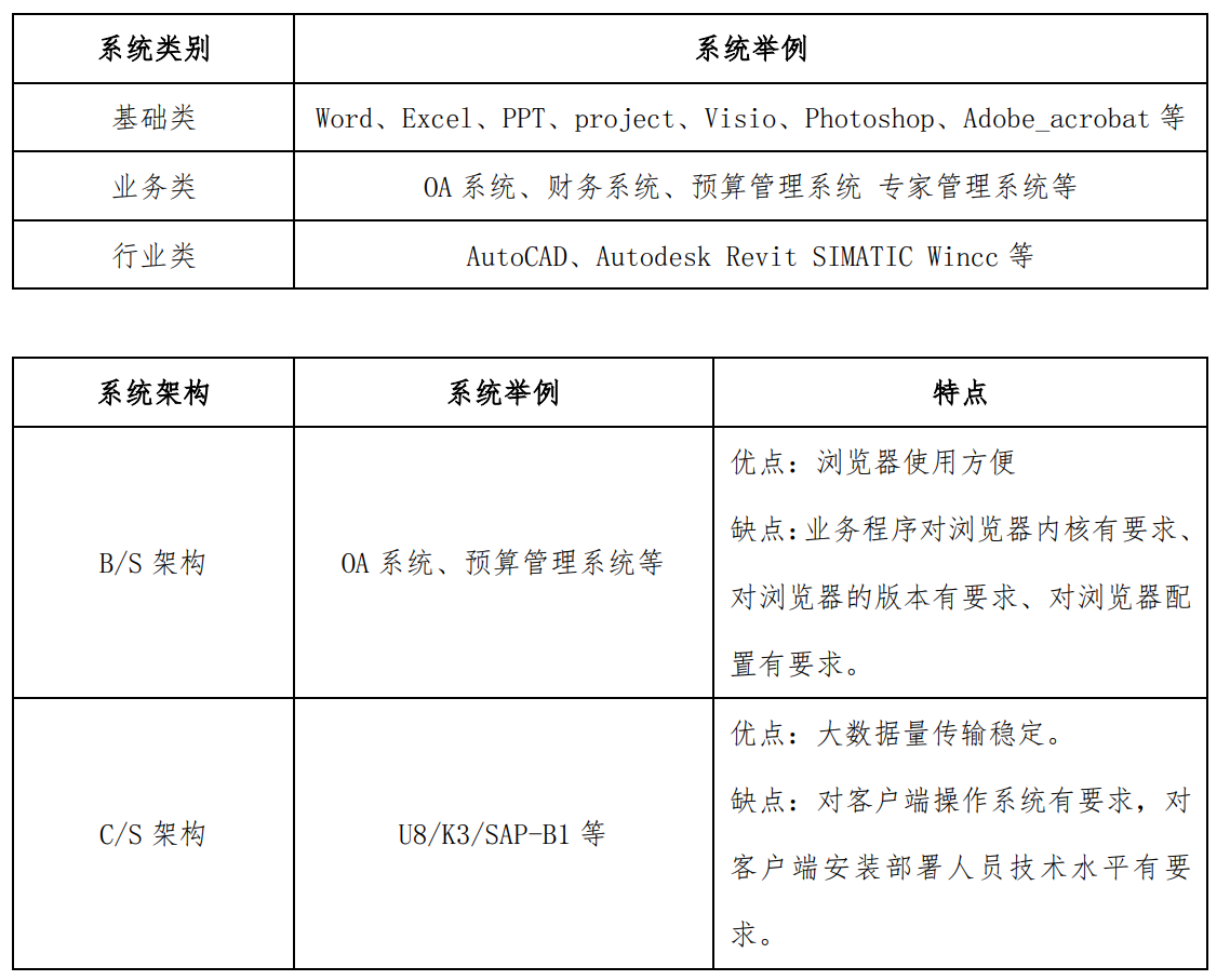 本次替换工作考虑到国产计算机产品处理器在性能和运行速度上的限制,以及许多应用软 件尚未与国产操作系统、国产数据库、国产中间件进行过完整的适配等现实问题,将会对面向公 众的应用系统不做替换,对部分部门核心业务系统不做替换,因此,在实际替代工作中将会出现 留有存量应用的情况。另外,在项目建设中及建成后会出现部分存量应用系统和替换后应用系统 共存、共用的现实情况。 通常这些应用系统从系统使用性质上可以分为基础类、业务类、行业类;从系统架构上可以 分为 B/S 架构和 C/S 架构系统。 基础类系统主要是终端使用人员每天都要使用的工具系统,比如:Word、Excel、PPT、压缩 软件、project、Visio、Photoshop、Adobe Acrobat 等; 业务类系统比如:OA 系统、财务系统、预算管理系统 专家管理系统等; 行业类系统比如:AutoCAD、Autodesk Revit、SIMATIC Wincc 等等。
